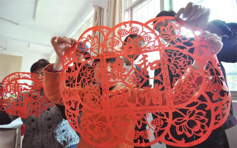 一沓画好图案的纸张,77岁的雅哈克(音译)一手用力压住纸角,一手紧握自制剪纸刀,用略有颤抖的手,沿着图形一刀、一刀“刻”下去。一旁,老师周淑英紧捏着剪纸刀上端,一边讲解,一边用手一点点纠正着雅哈克“下刀”的姿势。