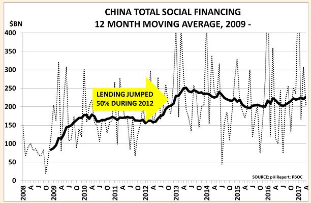 有企業和投資者認為,中國在10月影響重大的十九大召開之前將“一切照舊”。他們回顧2012年召開的十八大,想當然地認為中共領導人將再次聚焦于確保經濟穩定。但實際上,2012年是一次例外,而非規律。正如圖表所示,现在已經沒有必要通過重復2012年增加刺激性放貸50%來提振經濟。相反,社會融資總量增速實際上一直在放緩。