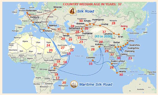 從經濟角度看(如以下地圖所示),一帶一路將把中國逐漸老齡化的人口(到2030年中國人口年齡中位數將達到43歲)與一帶一路沿線更年輕的國家聯系起來。其中多數國家的人口年齡中位數在17到30歲之間。一帶一路計劃將使中國受益于鄰國潛在的人口結構紅利。