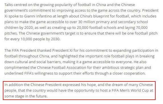 此外,中国国家主席表达了他的愿望,也是很多中国人的梦想,那就是这个国家能能够有机会在未来的某个时间段举办FIFA男子足球世界杯。