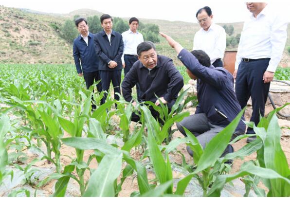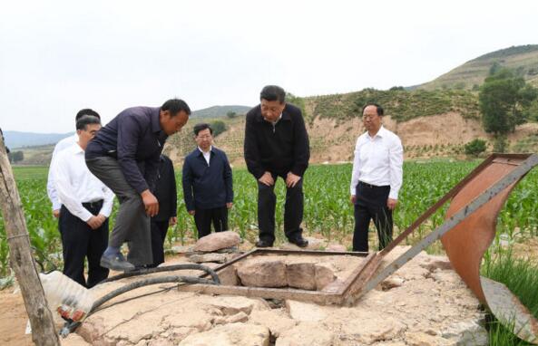 習近平走進趙家洼村的一片農田,察看玉米和蕓豆長勢。村支書告訴總書記,因為干旱,莊稼植株矮小,產量很低,村民們靠天吃飯。總書記向村民了解了地膜的保墑作用。總書記來到村里唯一的一口飲水井旁,登上用石塊壘起的井臺,仔細察看井里蓄水的情況。