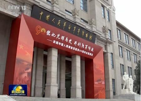 下午3時30分許,習近平等領導同志來到中國人民革命軍事博物館,走進展廳參觀展覽。展覽主體內容以時間為脈絡,突出展示我軍90年征程中歷經的重大戰役戰斗、重大歷史事件、重要決策過程和重大發展成就,重點設計了“井岡山會師”“論持久戰”“攻克錦州”“華北軍事演習”“進駐香港澳門”“汶川抗震救災”“古田全軍政治工作會議”、我軍現役主要裝備模型展示等景觀和展項,安排了陸海空軍武器裝備訓練模擬互動項目,通過1000多張照片、1300余件文物和大量圖表、制字、油畫、景觀、視頻、觸摸屏以及一批主戰裝備實裝、裝備模型等,全面反映了90年來人民軍隊在黨的領導下走過的光輝歷程、建立的豐功偉績,充分展現了我黨我軍在長期革命斗爭和建設實踐中培育形成的光榮傳統和優良作風,生動呈現了軍隊建設改革發展的巨大成就。