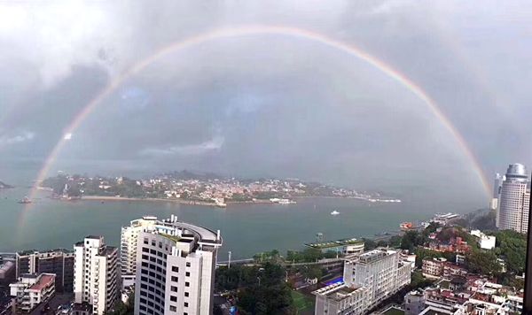 一陣大雨過后,昨早廈門放晴。意想不到的是,特殊的天氣條件下,廈門驚現難得一見的跨城彩虹!一時間,微信朋友圈都刷爆了。