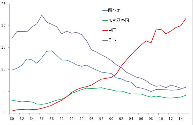 中國、日本、四小龍、東南亞各國對美國出口份額