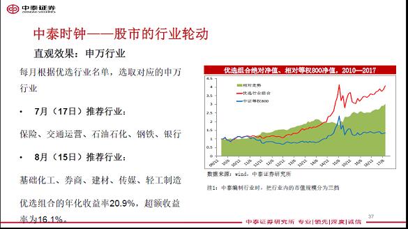 今年7月,中泰研究所推薦了保險、交通運營、石油石化、鋼鐵、銀行五大行業組合,該組合漲幅超越了指數漲幅。8月,我們又推薦了基礎化工、券商、建材、傳媒、輕工制造,更是大幅跑贏指數。因此,我們當前所做的中泰時鍾分析方法確實能夠提供有效的資產配置方案,當然,“中泰時鍾”的開發及應用時間還較短,需要進一步細化和完善。
