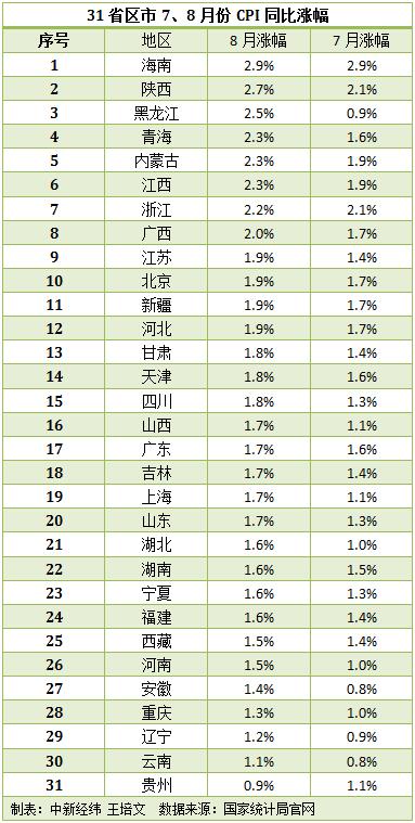 盡管大部分地區8月份物價漲幅出現回升,但總體仍處於低位運行。除海南、陝西、黑龍江、青海、內蒙古、江西、浙江、廣西外,其餘23個省份8月份CPI漲幅均低於2%。海南連續六月CPI漲幅高居首位,為2.9%,貴州的漲幅則低於1%。