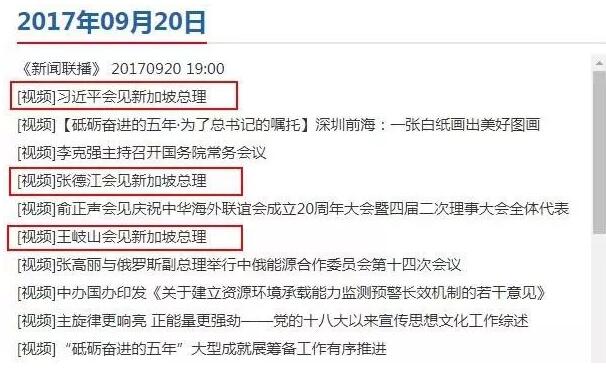 昨晚(9月20日晚)的新闻联播三条都和新加坡总理李显龙有关,前后时长7分钟。当日,国家主席习近平、全国人大常委会委员长张德江、中央纪委书记王岐山先后会见了李显龙。