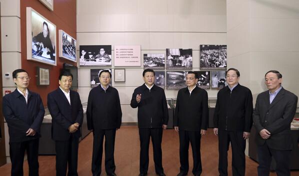2012年11月29日,习近平和中央政治局常委李克强、张德江、俞正声、刘云山、王岐山、张高丽等来到国家博物馆,参观《复兴之路》展览。(图片来源:新华社)