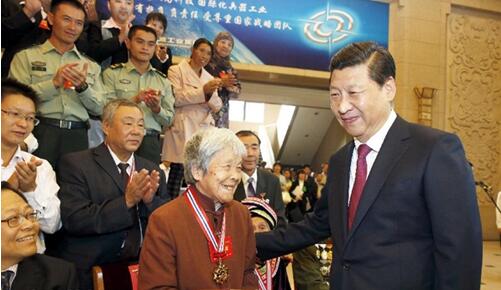 2013年9月26日,习近平在北京会见第四届全国道德模范及提名奖获得者。这是习近平同全国道德模范龚全珍亲切交谈。(图片来源:新华社)