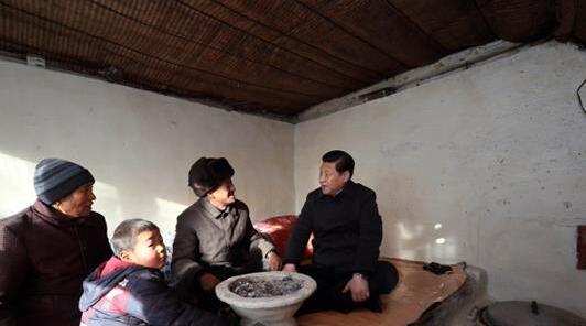 2012年12月29日至30日,习近平在河北省阜平县看望慰问困难群众。这是习近平在龙泉关镇骆驼湾村看望唐荣斌老人一家。(图片来源:新华社)