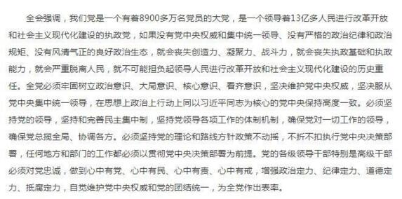 公报还用近500字,也就是五分之一的篇幅论述了坚持党的领导的重要性,其中比较新的表述是这一段: