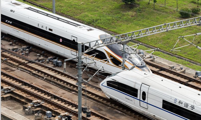 一列“复兴号”动车组在京沪高铁线路上与“和谐号”动车组交会。新华社