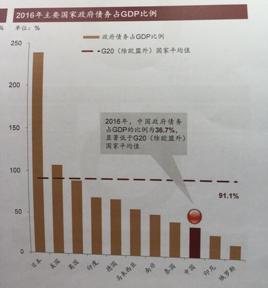 2016年中国中央政府债务的余额是12.01万亿,2014年预算法实施以后,地方债务出现了高速增长态势,去年地方债的余额达15.32万亿。从债务余额来看,中央政府和地方政府的债务总额占GDP的比重是36.7%,显著低于G20(除欧盟外)国家平均值91%,因此中国债务水平合理。