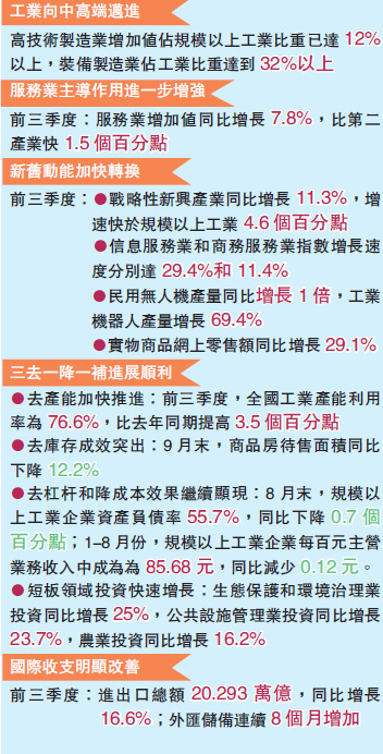 10月中旬,中國央行行長周小川出席國際貨幣基金組織/世界銀行年會期間表示,今年以來中國經濟增長動能有所回升,下半年有望實現7%的增長。此后公布的中國前三季度GDP數據顯示,中國的GDP同比增長6.9%,增速與上半年持平。周小川的表態和中國經濟的實際表現,讓不少專家已經確定,下半年中國經濟不會出現較大調整,全年GDP將保持6.8%-7%的增速,并且將進入平穩軌道。專家表示,中國經濟的增長對於周邊國家來說意味著更多的發展機會,對於世界經濟來說則意味著更加穩定的未來。中國可借此機會提升參與全球經濟治理的能力。香港商報記者 伍敬斌