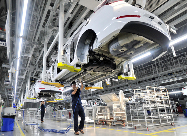 北京現代滄州工廠總裝車間生產線。 新華社