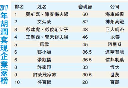 【香港商報网訊】胡潤研究院昨日發布其子榜《2017胡潤套現企業家榜》,今年共有30位企業家登上了《2017胡潤套現企業家榜》,其中,52歲的龔虹嘉、陳春梅夫婦過去一年套現60億成為「2017套現大王」,30位內地企業家共套現806.5億,馬雲透過減持其在美國上市公司阿里巴巴集團所擁有的部分股份累計套現約45億元,許家印累計從香港上市公司中國恆大獲得的分紅金額達到33億元。胡潤百富稱,減持上市公司股票和上市公司股票分紅是過去一年企業家大額套現的兩大主要途徑。