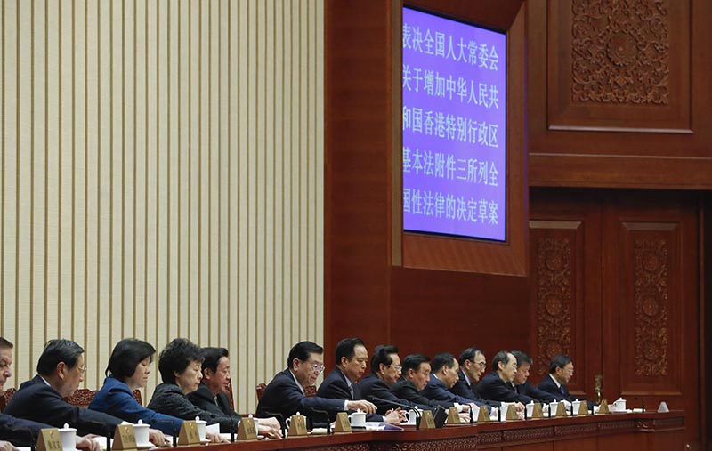 十二屆全國人大常委會第三十次會議昨日表決通過決定在香港基本法附件三、澳門基本法附件三中增加《中華人民共和國國歌法》。中新社