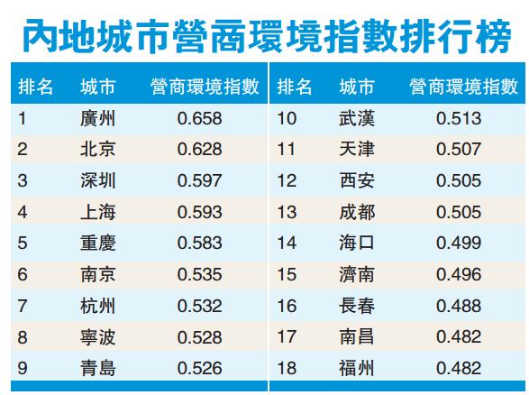 【香港商報网訊】粵港澳大灣區研究院昨日發布2017年中國城市營商環境報告指出,廣州、北京、深圳、上海、重慶位居中國城市營商環境前五名。第六名到第十名分別是南京、杭州、寧波、青島、武漢。
