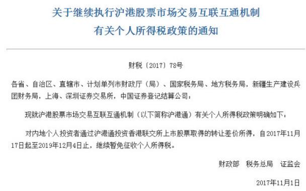 13日消息,從財政部獲悉,財政部、稅務總局、證監會聯合發布通知,對內地個人投資者通過滬港通投資香港聯交所上市股票取得的轉讓差價所得,自2017年11月17日起至2019年12月4日止,繼續暫免征收個人所得稅。