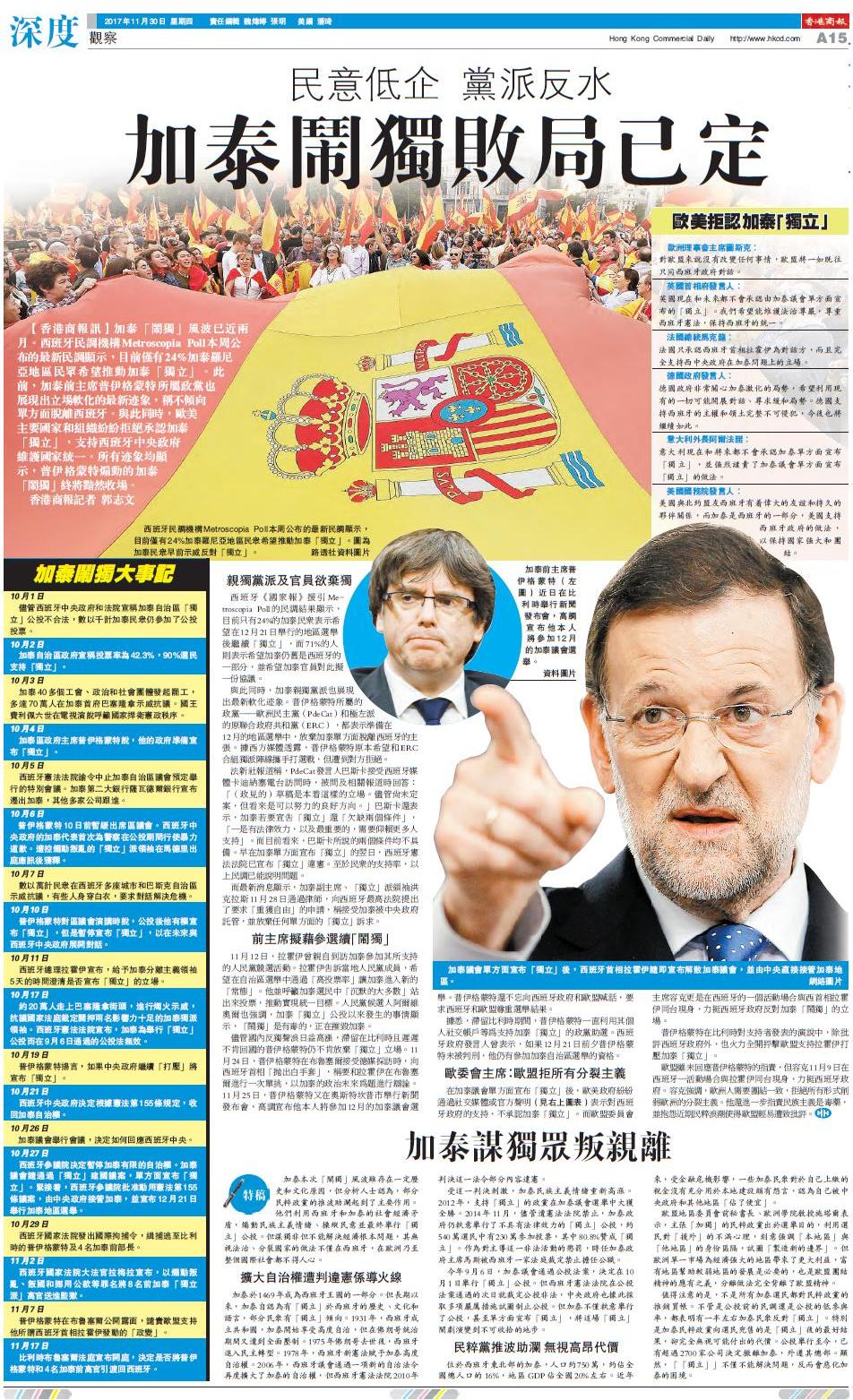 西班牙《國家報》援引Metroscopia Poll的民調結果顯示,目前只有24%的加泰民眾表示希望在12月21日舉行的地區選舉後繼續「獨立」,而71%的人則表示希望加泰仍舊是西班牙的一部分,並希望加泰官員對此擬一份協議。
