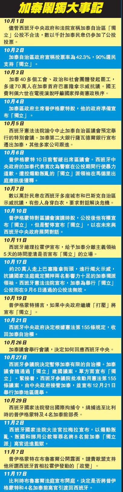 與此同時,加泰親獨黨派也展現出最新軟化迹象。普伊格蒙特所屬的政黨--歐洲民主黨(PdeCat)和極左派的原聯合政府共和黨(ERC),都表示準備在12月的地區選舉中,放棄加泰單方面脫離西班牙的主張。據西方媒體透露,普伊格蒙特原本希望和ERC合組獨派陣線攜手打選戰,但遭到對方拒絕。