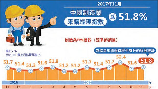 國家統計局昨日公布的數據顯示,2017年11月份,中國制造業采購經理指數(PMI)為51.8%,好於預期和前值,比上月上升0.2個百分點,制造業繼續保持穩中有升的發展態勢。受訪專家認為,11月制造業PMI數據出現回升的主要動力是生產和需求的改善,消費需求以及出口需求的增長抵消了環保限產對制造業生產的不利影響,未來中國經濟料會保持平穩增長。