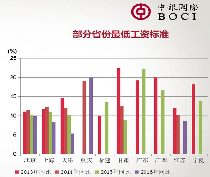 于是農村剩余勞動力不再充沛,轉移的速度在放慢,工資水平就會普遍上升。事實上最低工資標準這幾年各地都有大幅上升,而且幾乎不存在東中西部地區的差異。如果說存在東中西部的差異的話,西部地區最低工資上升更快。在過去幾年中間,最低工資水平上升得比較快的地區是寧夏、廣西、甘肅、重慶。相形之下,中國的一線城市北京上海天津反而漲速緩慢。這意味著靠廉價勞動力低成本的制造不會從深圳轉移到西部。