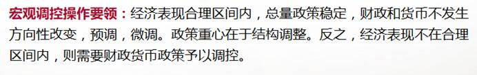 如果宏觀經濟始終在這個區間中運行,短期宏觀經濟政策就不會發生方向性的改變,政策的著力點是通過改革來調整結構,從而奠定中國經濟可持續增長基礎。如果宏觀經濟表現不在這個區間,那就要通過宏觀政策來進行針對性的宏觀調控。我們知道中國經濟進入新階段,結構性變化使中國經濟發生上限風險不大,但是下限風險一直很嚴重。這就意味著經濟宏觀政策不可能是一個刺激性政策,因為通過任何刺激也回不到兩位數。而應該是一個要把這個下行勢頭穩住的宏觀調控。
