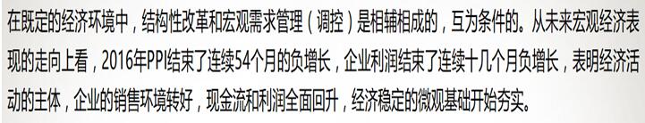 經過去年一年的供給側結構性改革的努力,去產能取得積極的進度,企業開始盈利,杠桿趨于穩定。過去曾擔心的去產能去杠桿的惡性循環得以打破。宏觀經濟的穩定和微觀經濟的務實,為中國經濟摘掉吊瓶創造了條件。