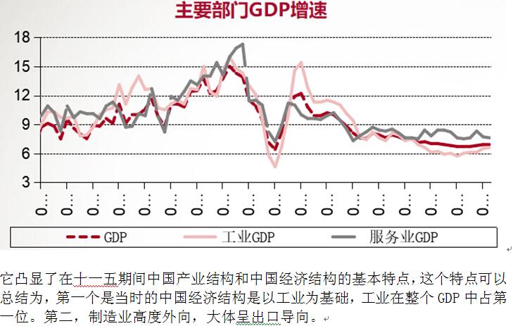它凸顯了在十一五期間中國產業結構和中國經濟結構的基本特點,這個特點可以總結為,第一個是當時的中國經濟結構是以工業為基礎,工業在整個GDP中占第一位。第二,制造業高度外向,大體呈出口導向。