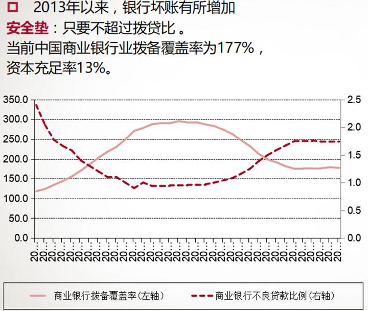 大家知道巴塞爾協議三中要求提取全部貸款百分之一做現金撥備,來對付壞賬。中國銀監會2013年就頒布了中國銀行業管理辦法,將撥貸比提升到2.5%,這是一個概率問題。中國的壞賬會不會達到全部資產的2.5%?如果不超過2.5%就意味著銀行有充足的資金來應付風險,如果再計算上利潤,大概在3%的壞賬才會導致銀行的資本損失。
