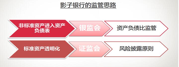 看不見摸不著,又如影相隨,就是影子銀行的特點。這叫見鬼了,老虎很可怕,但是可以找出老虎的秉性,根據老虎的秉性和規律可以控制老虎,然后將老虎關進籠子里。怎么治理影子銀行?就是把影子銀行由鬼變成老虎,這個過程叫做風險可辨識,風險可辨識則風險可控制。從學術意義講,影子銀行業務就是出了資產負債表但并沒有徹底出資產負債表中間的業務。治理它的辦法要么是回表,要么是徹底出表。所謂的回表就是回到資產負債表內,用資本來覆蓋風險,資本充足率是最重要。這也是銀監會的監管方式,資本充足率就是其監管的核心指標。所謂出表就是資產證券化,證券化就是透明化,透明化的核心是風險披露,這就是資本市場。所有上市公司的招股說明書中都有風險披露這一項。這也是證監會的監管方式。我們認為,對影響銀行業務的監管處理,將會履行非標準產品回表,標準資產出表方式進行。事實上隨著監管加強,今年影子銀行規模在大幅度減小。未來資產證券化成了前進的方向,請大家高度關注大資管條例的形成。