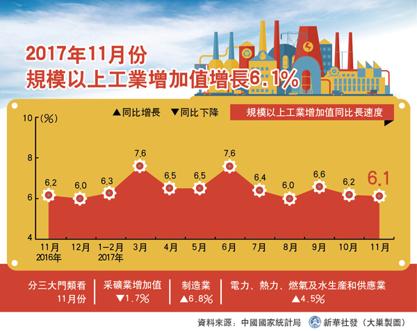 數據顯示,2017年11月份,中國規模以上工業增加值同比實際增長6.1%,增速比10月份回落0.1個百分點。工業增加值增速連續兩個月回落。1-11月份,中國規模以上工業增加值同比增長6.6%。