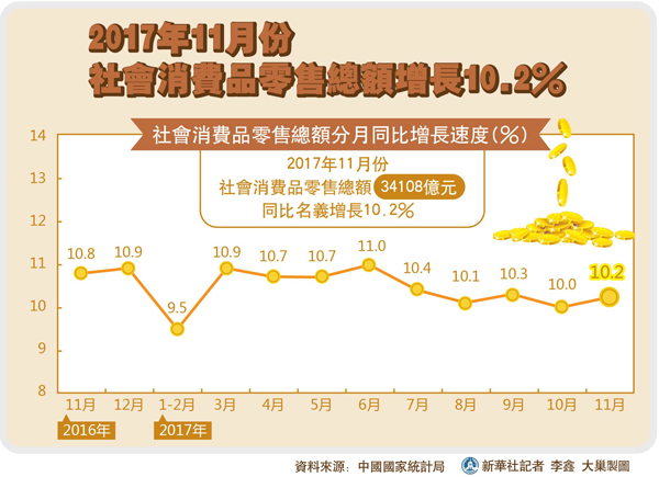 11月,中國消費繼續保持兩位數增長,同時網上消費增長強勁,消費升級態勢明顯。