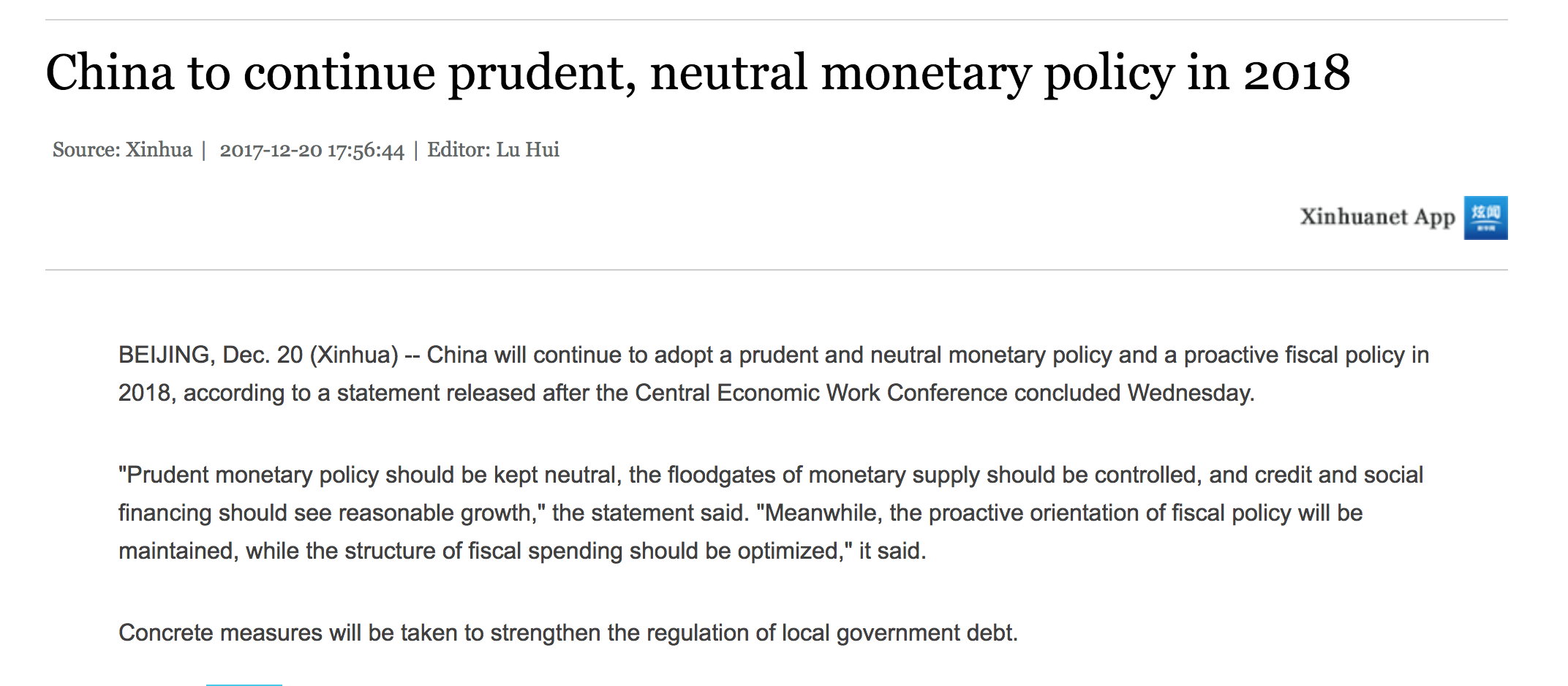 另据新华英文报道,中央经济工作会议称,2018年中国将继续实施稳健中性的货币政策和积极的财政政策。2018年继续深化供给侧改革。