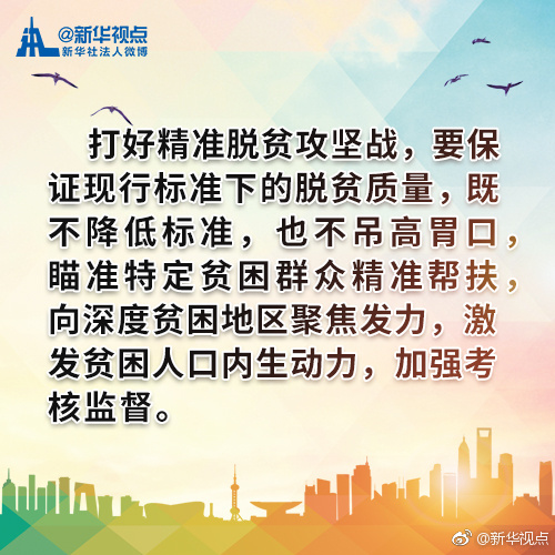 会议指出,打好精准脱贫攻坚战,要保证现行标准下的脱贫质量,既不降低标准,也不吊高胃口,瞄准特定贫困群众精准帮扶,向深度贫困地区聚焦发力,激发贫困人口内生动力,加强考核监督。