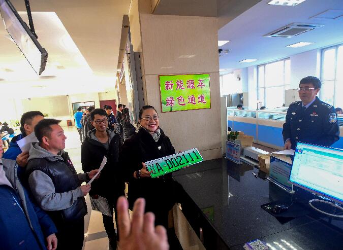 12月25日,沈阳车管所内,沈阳市民领取新能源汽车牌照。当天,辽宁省沈阳市全面启用新能源汽车专用号牌。