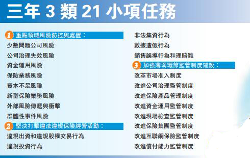 資金運用風險方面,重點防範保險資金違規投資風險,特別是逃避關聯交易監管、向特定關系人輸送利益的風險。重點防範非理性併購、炒作股票、透過金融產品巢狀違規開展不動產投資、短錢長投等激進投資風險。重點防範投資失敗導致大額損失的風險;保險業務風險方面,要防控流動性風險,關注由於管理能力不足可能導致的利差損風險。