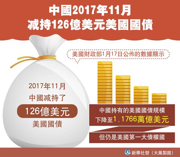 【又訊】美國財政部17日公布的數據顯示,中國去年11月份減持126億美元的美國國債。