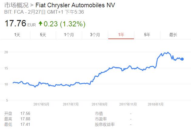 菲亚特克莱斯勒股价过去12个月大涨了69%,市值达到270亿欧元。