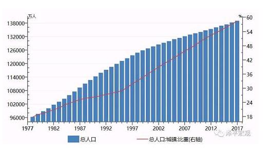 2017年常住人口城镇化率为58.52%,比上年末提高1.17个百分点。改革开放之初,中国城镇化率只有17.9%,过去四十年,中国城镇化率提高了40个百分点,新增城镇人口6.4亿人,可为波澜壮阔,再造欧美(欧洲人口7.4亿人,欧元区人口5.1亿人,美国人口3.2亿人,日本1.3亿人)。成就了过去中国重化工业、大规模基础设施投资、房地产、消费升级等的飞速发展。