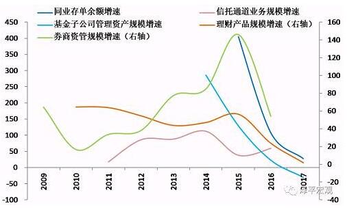 信贷上升社融下降表明监管趋严下表外回表,影子银行体系融资将大幅收缩:信托贷款、委托贷款、资管计划、基金子公司产品等通道业务面临大幅下滑,表外理财、同业存单等影子银行资金来源面临收缩,表外回表带来表内贷款上升以及银行补充资本金压力。房地产调控,居民抵押贷款下降。金融降杠杆效果持续显现,同业存单、表外理财、通道委外业务增速放缓。
