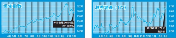 個股方面,越秀地產(123)去年盈利上升46.7%至22.6億元,期內毛利率為25.7%,上升4.9個百分點。全年錄得合同銷售408.7億元,上升35.1%,超越全年目標的360億元。今年合同銷售目標為550億元,較去年上升35%,可售資源則為1011億元,意味超過五成的去化率。國家倡議發展大灣區,集團約七成土地儲備在該區,可望受惠政策。建議於1.6元吸納,上望1.8元,跌穿1.5元止蝕。