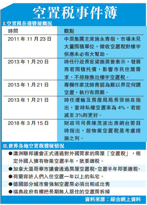 對於有人提議政府設空置物業稅,德勤中國稅務合夥人陳嘉華早前表示,其他國家為抑制炒樓熱,推行該稅項確實取得成效,但若在香港推行,則還需要深入研究,因香港空置率只有不足2%,即使推行,能為政府帶來的收益亦很有限。