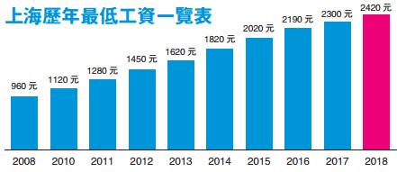 另外,上海將從2018年4月1日起調整最低工資標準。月最低工資標準從2300元調整到2420元,增加120元;小時最低工資標準從20元調整到21元。據上海市人社局消息,在調整最低工資標準時,主要考慮城鎮低收入家庭基本生活費用支出、城鎮居民消費價格指數、職工平均工資、經濟發展水平、企業人工成本等因素,既盡最大可能增強低收入勞動者的獲得感,又充分考慮目前經濟環境下企業的承受能力,兼顧了企業和勞動者雙方的利益。據了解,2008年上海月最低工資為960元,2018年上漲為2420元,十年漲了約1.5倍。