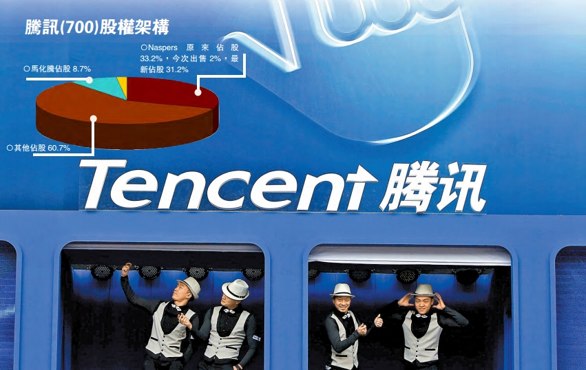 【香港商報网訊】記者李映萱報道:騰訊控股(700)第一大股東Naspers昨向投資者公告,將出售1.9億股騰訊股份(價值106億美元),對騰訊持股比例將從33.2%降至31.2%。騰訊昨收報439.4元,大跌23.2元或5%,單日蒸發2200億元。以騰訊昨日收盤價計算,1.9億股騰訊股票價值834.86億元。