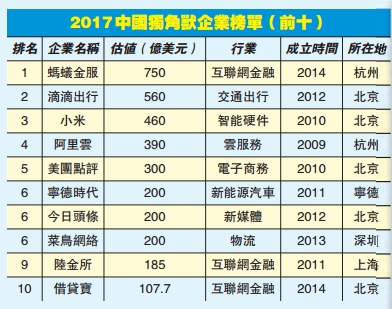 2016年,全國共有131家獨角獸企業,出現了7家估值超過100億美元的超級獨角獸,分別為螞蟻金服(750億美元)、小米(460億美元)、阿里雲(390億美元)、滴滴出行(338億美元)、陸金所(185億美元)、美團點評(180億美元)、大疆創新(100億美元)。