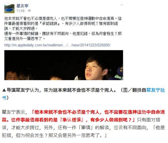 台湾“东森新闻网”2014年12月24日报道称,“太阳花学运”头目陈为廷自爆曾在公车上对女乘客袭胸,就在岛内网友痛骂陈“人面兽心”“行为下流”时,瞿友宁却站出来声援,称“他本来就不会也不必须是个完人”。