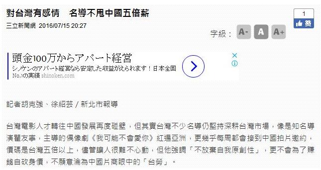 他说,“台湾演员在工酬上面,其实比大陆演员来的相对低一点”“大概每个礼拜都可以接到大陆的邀约,价码是台湾五倍以上,尽管让人很难不心动,但我不倾向用一种低价倾销的方式去中国大陆工作”。他还强调自己对台湾有感情,不会为了赚钱自砍身价,不愿意沦为大陆片商眼中的“台劳”。