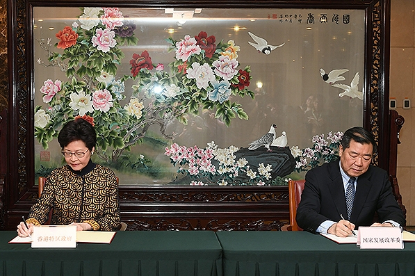 特首林鄭月娥去年12月在北京與國家發改委主任何立峰簽署安排。圖:新聞處